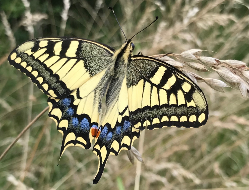 Na een paar uur zeisen in ons veld en een kort buitje brak de zon door. Daarmee kwamen ook alle vlinders tevoorschijn. Waaronder het zeer zeldzame geelsprietdikkopje. Geen makkelijke determinatie maar wat zijn we blij dat deze soort aanwezig is op het veld. Naast het geelsprietdikkopje vlogen er andere soorten dikkopjes rond, zandoogjes en een vers uit de cocon gekropen koninginnenpage. De zuidhelling van het perceel is zoals verwacht erg gunstig voor de vlinders en de vegetatie.